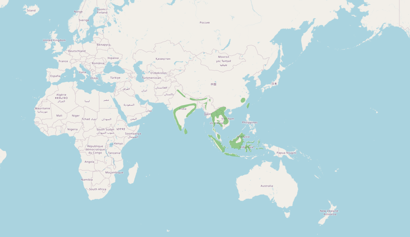 マレー半島、インドネシア、マレーシア、台湾、中国南東部、ベトナム、カンボジア、タイ、スリランカ、インド、ネパールなどの山岳地に分布する。東南アジアの森林地帯に分布域を有する。個体数の減少傾向は続いているようだが、その減少は「絶滅危惧 II 類」に達するほど急速ではないとしている。これらの理由から、この種は「LC(低懸念)」と評価されている。